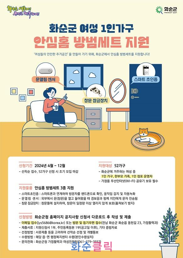 지원 대상은 화순군에 거주하는 여성 중 1인 가구, 한부모 가족, 1인 점포 운영자로 군 홈페이지 공지 사항에서 신청서를 내려받아 작성 후 담당자 이메일(jys5686@korea.kr)이나 군청 방문, 등기우편으로 접수하면 된다.