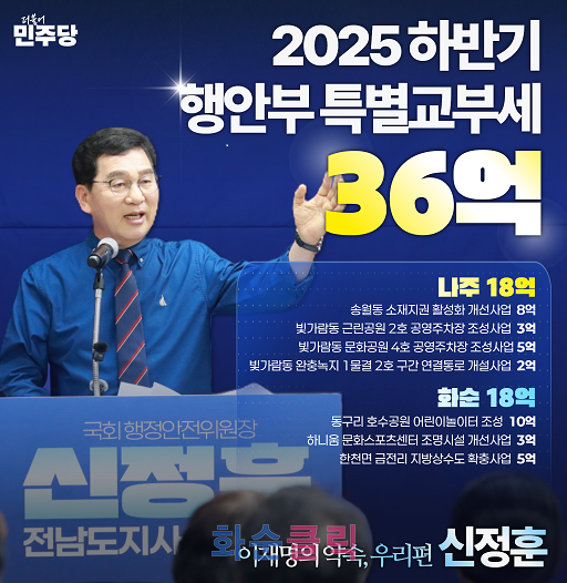 ❍ 신정훈 위원장은 “ 한정된 재정 여건 속에서도 지역에 조금이라도 더 도움이 될 수 있도록 예산 확보에 힘써왔다 ” 며 “ 이번 특별교부세가 나주와 화순의 생활환경 개선과 주민 편의 증진에 실질적인 보탬이 되길 기대한다 ” 고 말했다 .