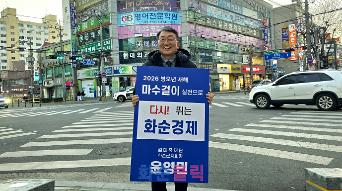 윤영민 김대중재단 화순군지회장은 2026년 병오년 새해 첫날, 화순읍 일원에서 ‘마수걸이 실천으로 다시 뛰는 화순경제’라는 문구가 적힌 피켓을 들고 민생경제 회복을 염원하는 캠페인을 펼쳤다.