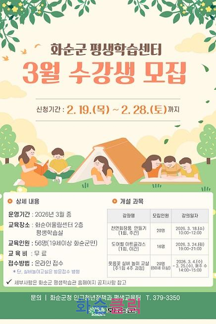 화순군(군수 구복규)은 19일 지역 주민들의 평생학습 참여 기회를 확대하기 위해 오는 3월부터 화순 어울림센터 내 평생학습센터에서 매월 다양한 평생학습 프로그램을 운영한다고 밝혔다.