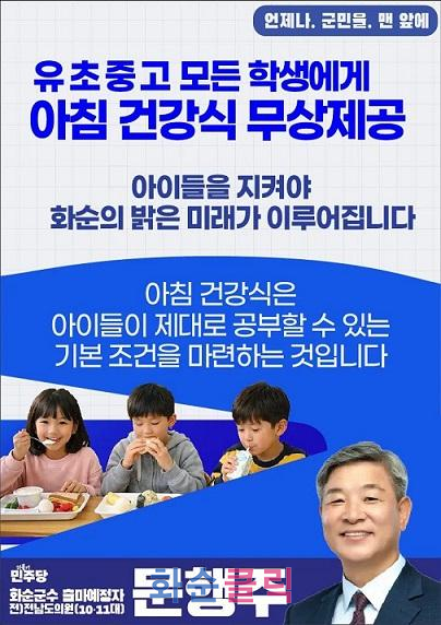 문행주 화순군수 출마자가 화순 관내 유치원과 초·중·고 모든 학생을 대상으로 아침 건강식을 무상 제공하는 공약을 발표하며, ‘아이 키우기 좋은 화순’ 조성을 위한 교육·복지 정책을 제시했다.