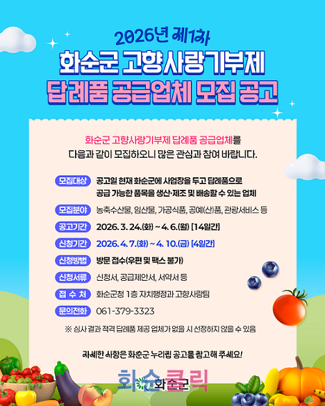 화순군(군수 구복규)은 24일 고향사랑기부제 활성화와 기부자 만족도 제고를 위해 2026년 제1차 고향사랑기부제 답례품 및 공급업체를 모집한다고 밝혔다.