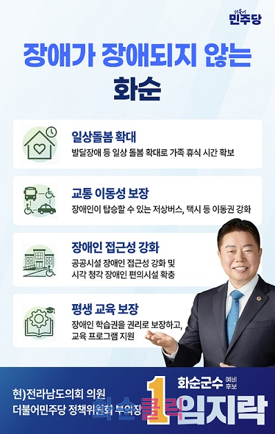 □ 더불어민주당 임지락 화순군수 예비후보는 20일 장애인의날을 맞아 장애인 정책을 발표하면서 ‘대리투표 파문’으로 잠시 중단되었던 정책 행보를 재개하였다.