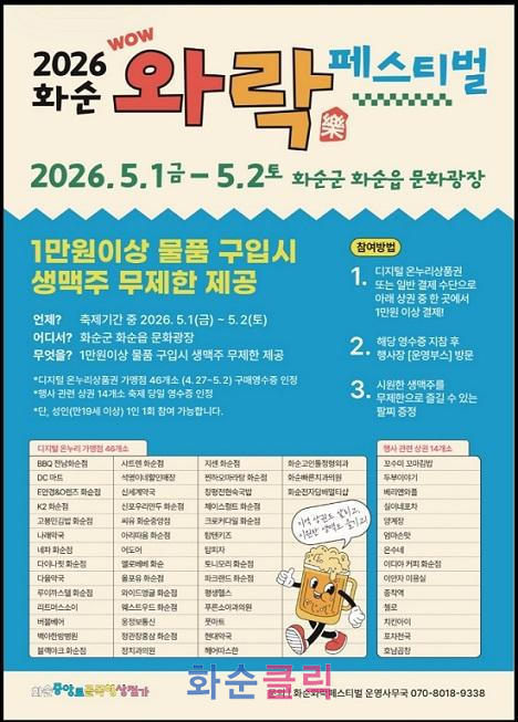 화순군(군수 구복규)은 오는 5월 1일부터 2일까지 이틀간 화순읍 광덕문화광장 일원에서 ‘2026 화순 와락 페스티벌’을 개최한다고 밝혔다.