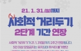 사회 화순클릭2021. 01.18화순군은 16일 발표한 정부 방침에 따라 사회적 거리두기 2단계를 18일부터 31일까지 2주간 연장하고 일부 시설에 대한 방역 조치를 조정한다고 밝혔다. 5인부터 사적 모임 금지, 식당 등 다중 이용시설에 5명 이상 예약과 동반 입장 금지, 100인 이상 모임‧행사 금지 등 핵심 방역수칙은 그대로 유지된다. 카페, 종교 시설 등 일부 시설의 방역 조치를 조정됐다. 영업시간 전체 포장‧배달만 가능했던 카페는 식당과 똑같은 기준이 적용돼 오전 5시~오후 9시 매장 내 영업이 가능하다. 오후 9시 이...