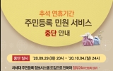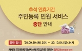 사회 화순클릭2020. 09.22화순군은 차세대 주민등록 시스템 전면 도입을 앞두고 추석 연휴 주민등록 민원 서비스를 중단한다고 밝혔다. 서비스 중단 기간은 오는 29일 20시부터 10월 4일 24시까지 약 5일간이다. 이 기간에는 행정서비스 포털 서비스도 이용할 수 없다. 주민등록 관련 발급·조회 서비스 27종을 비롯해 무인 민원 발급기 서비스 전체가 중단된다. 이에 따라 화순군은 서비스 중단에 따른 민원인의 불편을 최소화하기 위해 관내 무인 민원 발급기 11대에 중단 안내문을 부착하고 중단 안내 현수막을 설치, 안내할 예정이다. 군 관...