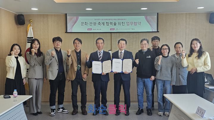 화순군(군수 구복규)은 19일 화순군문화관광재단(대표이사 강신기)과 광주광역시 동구문화관광재단(대표이사 문창현)이 문화·관광·축제 상호협력 업무협약을 맺고 재단 간 상호협력을 약속했다고 밝혔다.