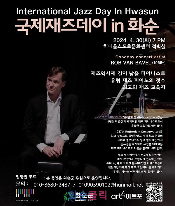 ‘국제재즈데이 in 화순’은 유네스코 지정 '2024년 국제 재즈데이를 맞이해 (사)아트포(대표 정회수)에서 세계적인 재즈 피아니스트 롭 반 바벨(Rob V Bavel)을 초대해 추진하는 행사로 재즈의 정수를 직접 관람할 수 있는 자리이다.