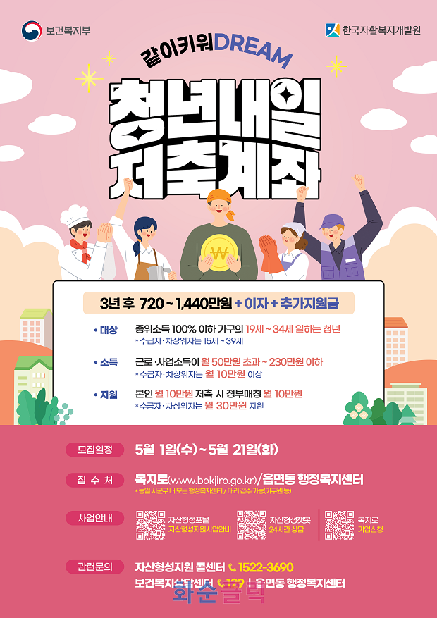 화순군(군수 구복규)은 2일 일하는 청년들이 미래에 대비해 목돈을 마련할 수 있도록 돕는 ‘청년내일저축계좌’ 신규 가입자를 오는 21일까지 모집한다고 밝혔다.