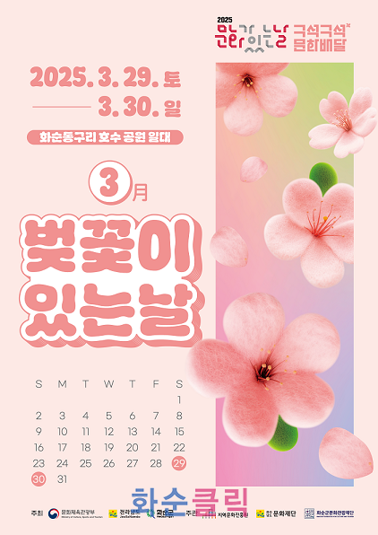 (재)화순군문화관광재단(이사장 구복규)는 오는 29일과 30일 양일간 전남 화순동구리호수공원에서 「벚꽃이 있는 날 Part2」 행사를 기점으로 ‘2025 문화가 있는 날 - 구석구석 문화배달’ 활력촉진형 사업을 시작한다.