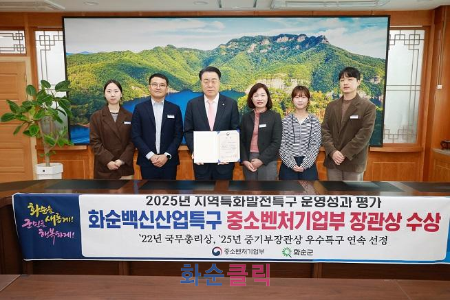 화순군(군수 구복규)은 중소벤처기업부에서 실시하는 '2025년도 지역특구 운영 성과 평가에서 화순백신산업특구가 ‘우수 특구’로 선정돼 중소벤처기업부 장관상의 영예를 차지했다고 10일 밝혔다.