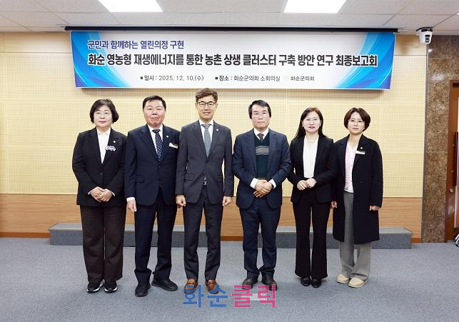 류종옥 대표의원은 “이번 연구는 농업과 재생에너지가 함께 성장하는 화순의 미래 전략을 마련하는 과정이었다”며 “전문가 의견과 현장 경험을 바탕으로 주민이 주체가 되는 상생형 모델이 화순에서도 실현될 수 있도록 정책화에 최선을 다하겠다”고 말했다.