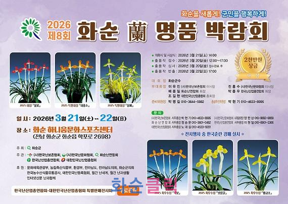 전남 화순군(군수 구복규)은 ‘2026 제8회 화순 난 명품 박람회’를 오는 3월 21일(토)부터 22일(일)까지 화순 하니움문화스포츠센터 실내체육관에서 개최한다고 밝혔다.