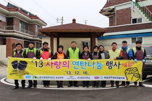 이번 연탄나눔 봉사는 바리오화순과 한국광해관리공단 호남지사의 지원으로 화순지역의 저소득 가정에 난방용 연탄 총 2,000장이 제공되었