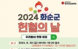 탑뉴스 화순클릭2024. 08.27[화순클릭] “사랑의 헌혈”로 이웃들에게 희망을 선물 화순군(군수 구복규)이 오는 8월 30일(금) 오전 9시부터 오후 4시 30분까지 군청 행복민원과 앞 도로변과 하니움문화스포츠센터 정문 주차장에 주차된 이동헌혈차량에서 생명나눔 ‘사랑의 헌혈’ 행사를 진행한다. 본 행사는 폭염과 학생들의 여름방학 영향으로 단체 헌혈이 급감한 하절기를 맞아 응급혈액 확보를 위해 긴급히 마련되었으며, 군민과 공직자 등 100여 명이 동참할 것으로 예상된다. 헌혈은 남성 50kg·여성 45kg 이상 건강한 사람으로 16세~ 6...