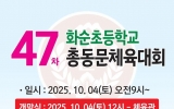 탑뉴스 화순클릭2025. 10.10화순초등학교 제74차 총동문체육대회(대회장 김영호)가 10월 4일(토) 모교 운동장에서 열린다. 이번 체육대회는 ‘모교 사랑, 동문 화합, 희망 화순!’을 슬로건으로 오전 9시부터 오후 5시가지 다채롭게 진행된다. 오전에는 배구, 족구, 윷놀이 등 체육행사가 열리며 오전 12시 개막식에 이어 오후에는 기수별 추천을 받은 참가자들의 노래자랑이 마련돼 흥겨운 축제의 자리가 될 전망이다. 동문들의 숨은 끼와 열정을 마음껏 발산하는 노래자랑은 기수 당 1명씩 사전 접수를 받아 진행된다. ...