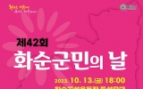 탑뉴스 화순클릭2023. 10.05제42회 화순군민의 날이 오는 13일(금) 오후 6시 공설운동장 특설무대에서 열린다. 화순군(군수 구복규)은 이번 군민의 날을 화합과 힐링의 성대한 잔치로 개최할 예정이라고 밝혔다. 특히, 이번 행사는 118년의 역사를 간직하고 올해 6월에 문을 닫은 화순탄광의 의미를 되새기고, 근로자들에게 위로와 감사의 마음을 전하기 위해 퇴직자 등 200여 명을 특별 초청했다. 행사는 다양한 분야의 예술인들이 참여하는 식전 공연과 기념식(군민의 상 시상, 주제공연), 읍면 대항 군민 화합 노래...